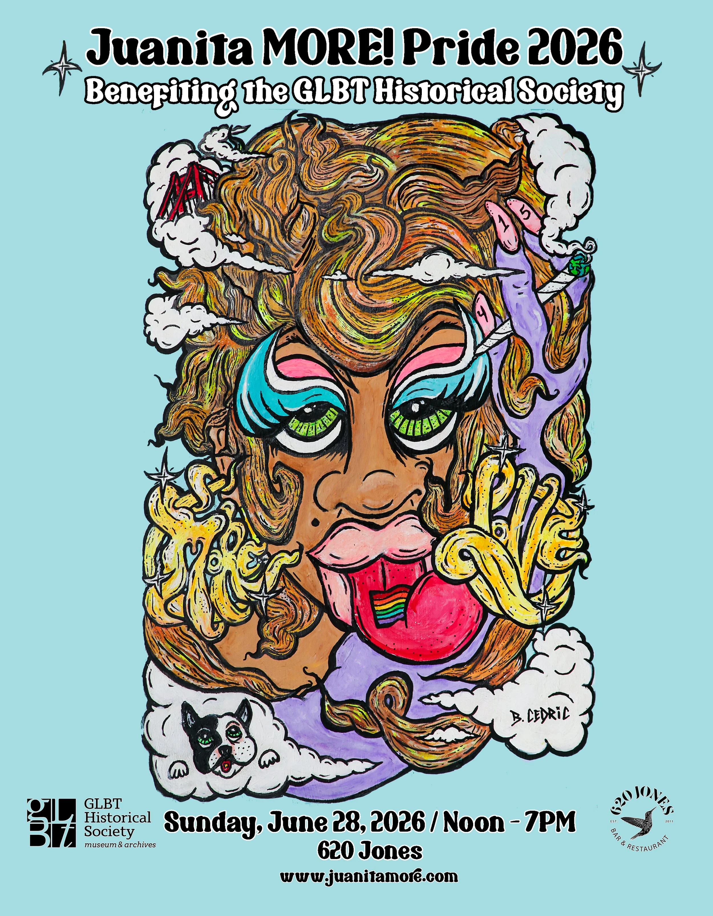 Each year for Pride, I commission an artist to create the poster artwork for my annual Pride Party. My general art direction helps bring clarity and definition to the poster and convey a connection to our guests about what they will experience. I first ask that they capture my beauty (of course), incorporate my French bulldogs, and add something historic that represents the city I love and live in: San Francisco.